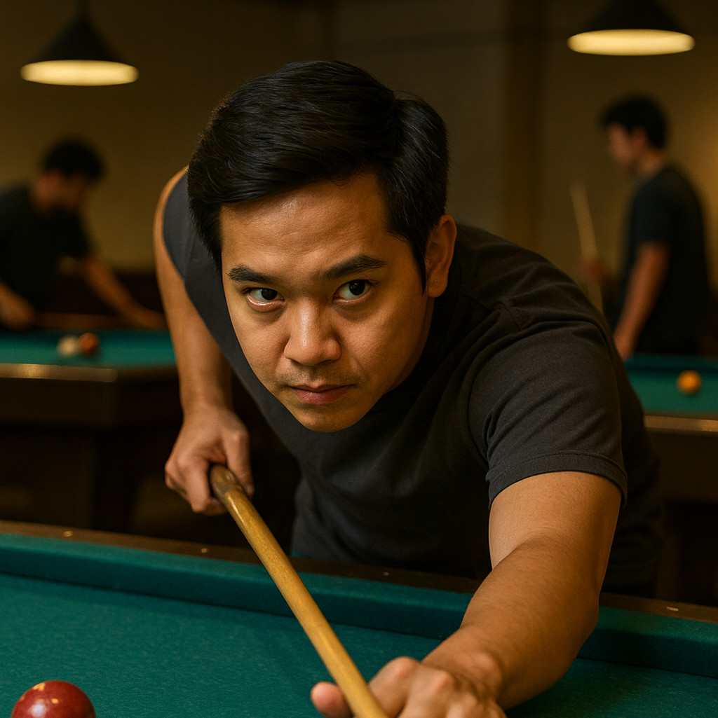 Makanya itu saya mulai jatuh cinta sama billiarder ini gara-gara nonton satu shot keren pas SEA Games. Saya gak ketemu lagi videonya di youtube, tetapi saya itu ingat banget, dari posisi gitu pun bisa pukul ya dia. Makanya dari sana saya bener-bener mikir “wah kok bisa begitu ya”, dan sejak itu saya jadi fans berat dia. Sekarang kalau ada waktu kosong setelah shift, saya selalu latihan dan coba tiru gaya main dia walau masih jauh banget hasilnya. wkwkwkwk